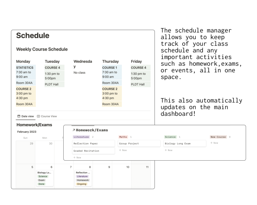 - Interactive To-Dos: Create to-do lists for each of your classes, and then use the dashboard to see all of your tasks at a glance. You can also add due dates, notes, and tags to your to-dos, and then use the dashboard to filter your tasks by due date, priority, or tag.